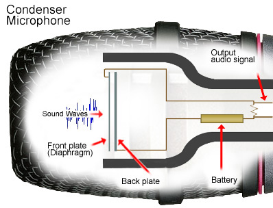 Condenser microphones are used for high quality vocal recording and overheads in a drum mic set-up and can pick up sounds in a room rather than from a specific source. Condenser microphones require power (phantom power) from a battery or external source. The resulting audio signal is stronger signal than that from a dynamic. Condensers also tend to be more sensitive and responsive than dynamics, making them well-suited to capturing subtle nuances in a sound. They are not ideal for high-volume work, as their sensitivity makes them prone to distort. A capacitor has two plates with a voltage between them. In the condenser mic, one of these plates is made of very light material and acts as the diaphragm. The diaphragm vibrates when struck by sound waves, changing the distance between the two plates and therefore changing the capacitance. Specifically, when the plates are closer together, capacitance increases and a charge current occurs. When the plates are further apart, capacitance decreases and a discharge current occurs.